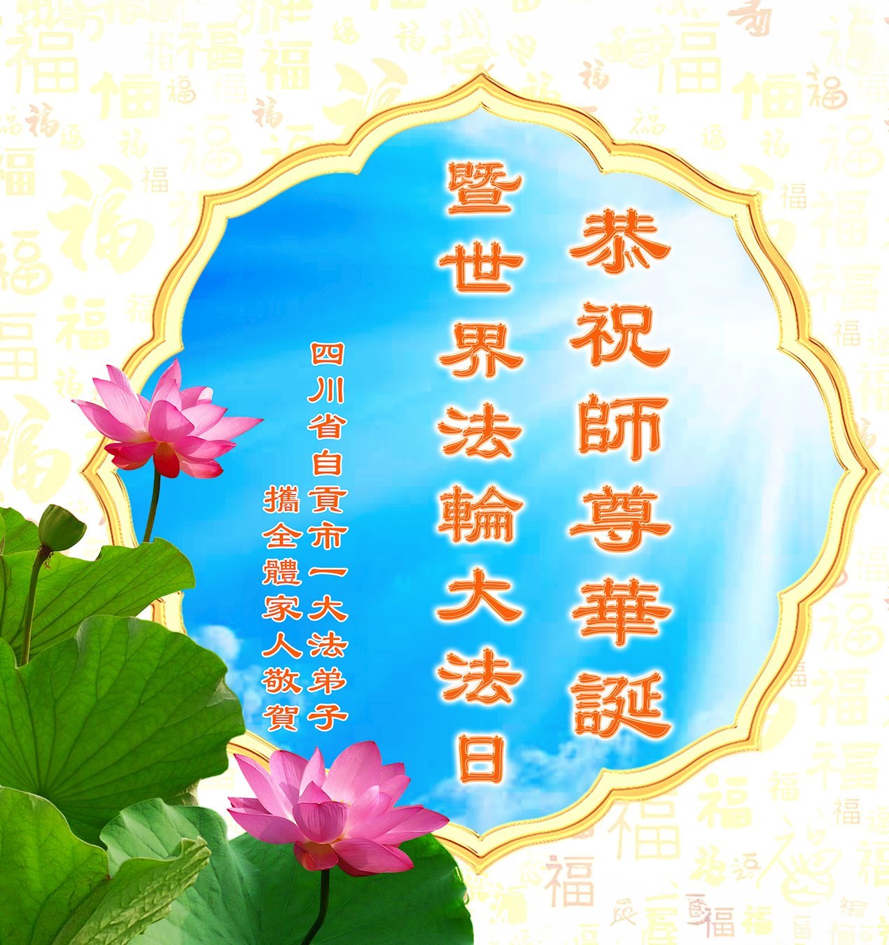 四川省自贡市一大法弟子携全体家人恭贺世界法轮大法日暨师尊生日快乐!