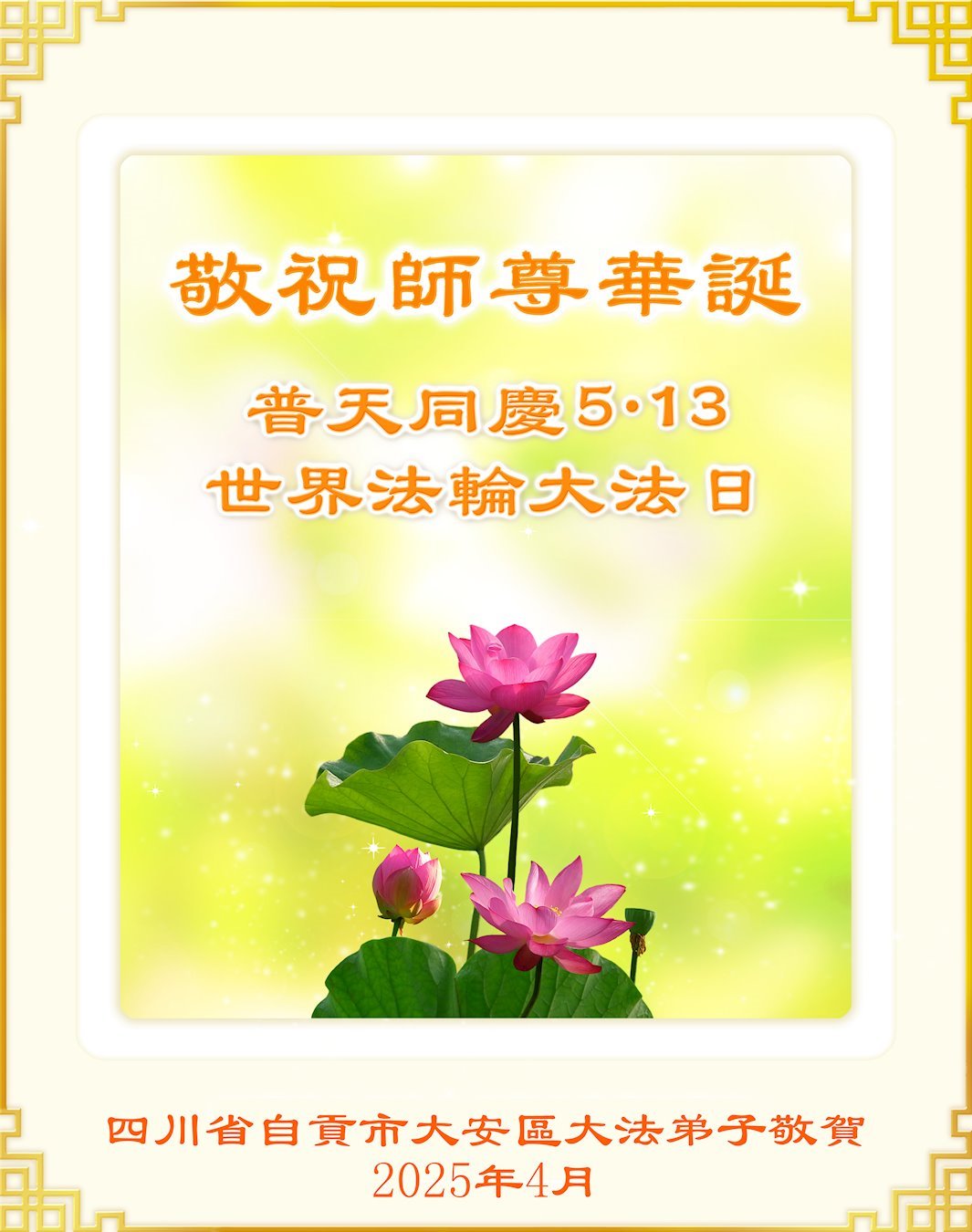 恭祝师父生日快乐! 同庆5.13世界法轮大法日! 世界需要真善忍! 四川省绵阳市大法弟子及全家人敬上 2025年4月28日 四川省自贡市一学法小组全体大法弟子恭贺世界法轮大法日暨师尊生日快乐!