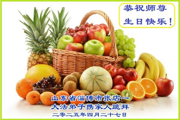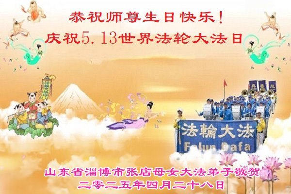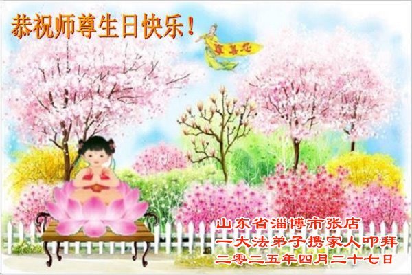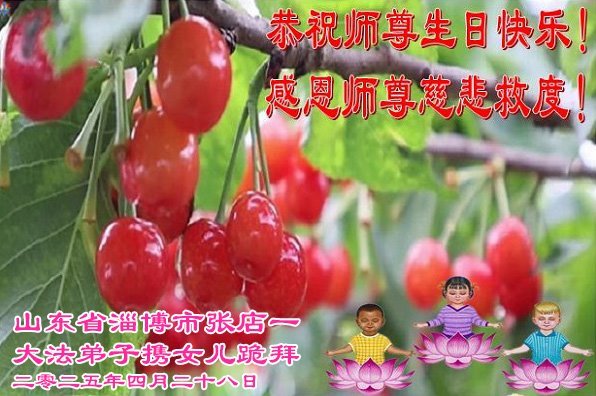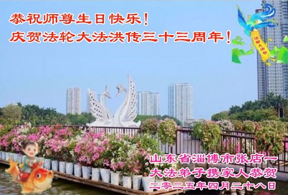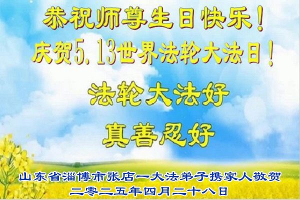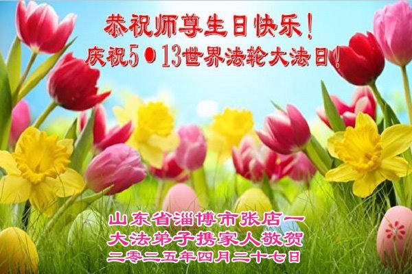 山东省淄博市张店一大法弟子携家人恭贺世界法轮大法日暨师尊生日快乐!