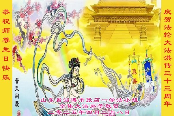 山东省淄博市张店一学法小组全体大法弟子恭贺世界法轮大法日暨师尊生日快乐!