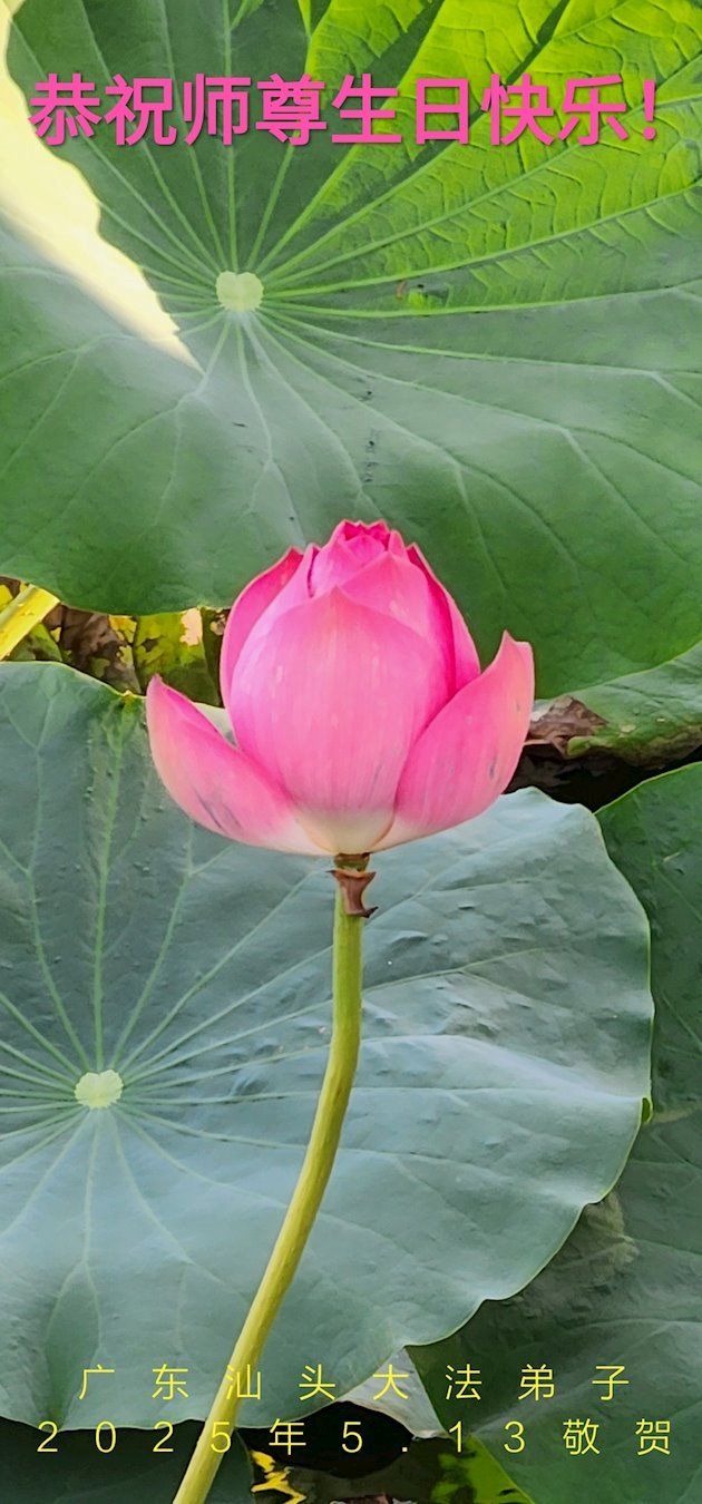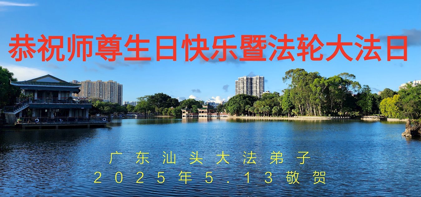 恭贺世界法轮大法日暨师父华诞! 圣世天朝师尊临,法正人间万世行。新宇无私心共明,大法正道救众生。 沧海桑田更新正,传统回归天地青。五月十三普天庆,师父创世智慧丰。 广东省深圳大法弟子敬上 二零二五年四月二十五日 广东省汕头市大法弟子恭贺世界法轮大法日!