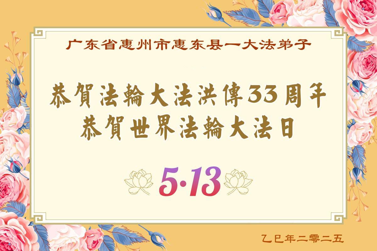 恭贺大法洪传33周年!恭祝师尊生日快乐!感谢师尊慈悲苦度,感恩师尊。 法轮大法好,真善忍好。 广东省惠东一大法弟子及其家属敬上 二零二五年四月二十九日 广东省惠州市惠东县一大法弟子恭贺世界法轮大法日!