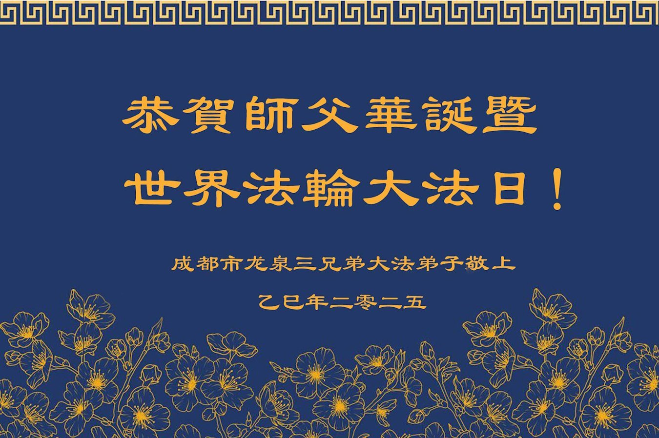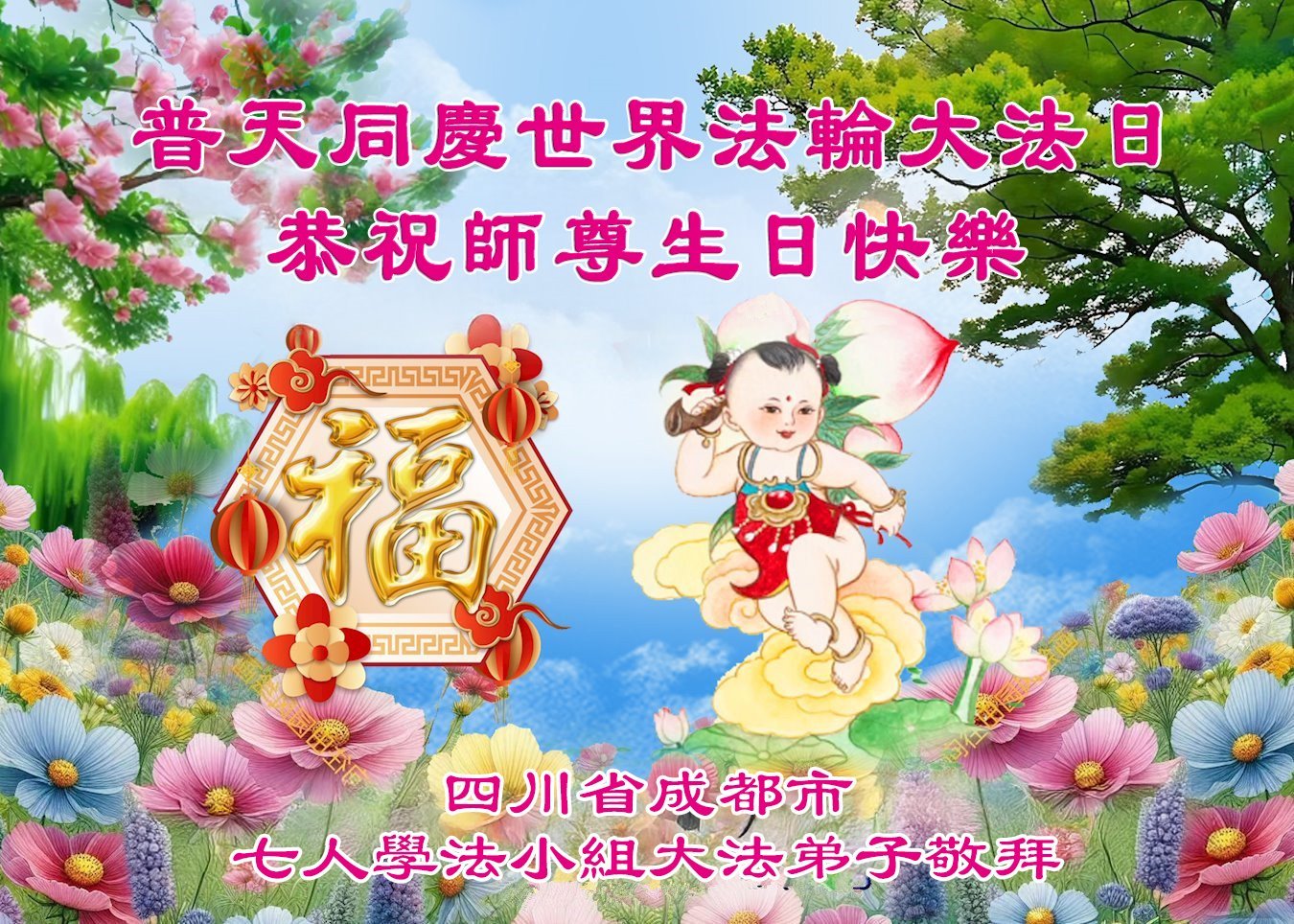 普天同庆世界法轮大法日!恭祝师尊生日快乐! 四川省成都市七人学法小组大法弟子敬上 四川省成都市一学法小组大法弟子恭祝慈悲伟大的师尊生日快乐!恭贺世界法轮大法日!