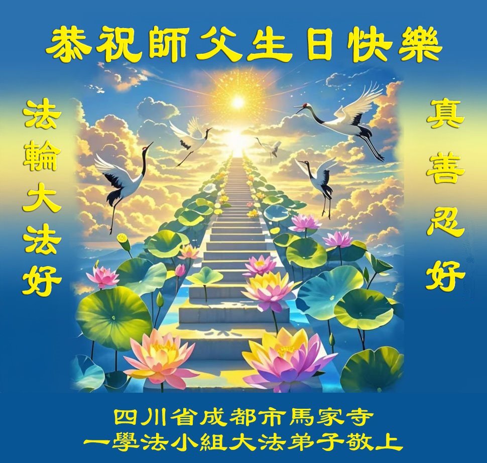 请师父放心,弟子一定修好自己,做好三件事,多救众生,跟师父回家! 四川成都市郫都区一大法弟子敬上 二零二五年四月二十九日 四川省成都彭州大法弟子及家人恭祝师父生日快乐!恭贺世界法轮大法日!