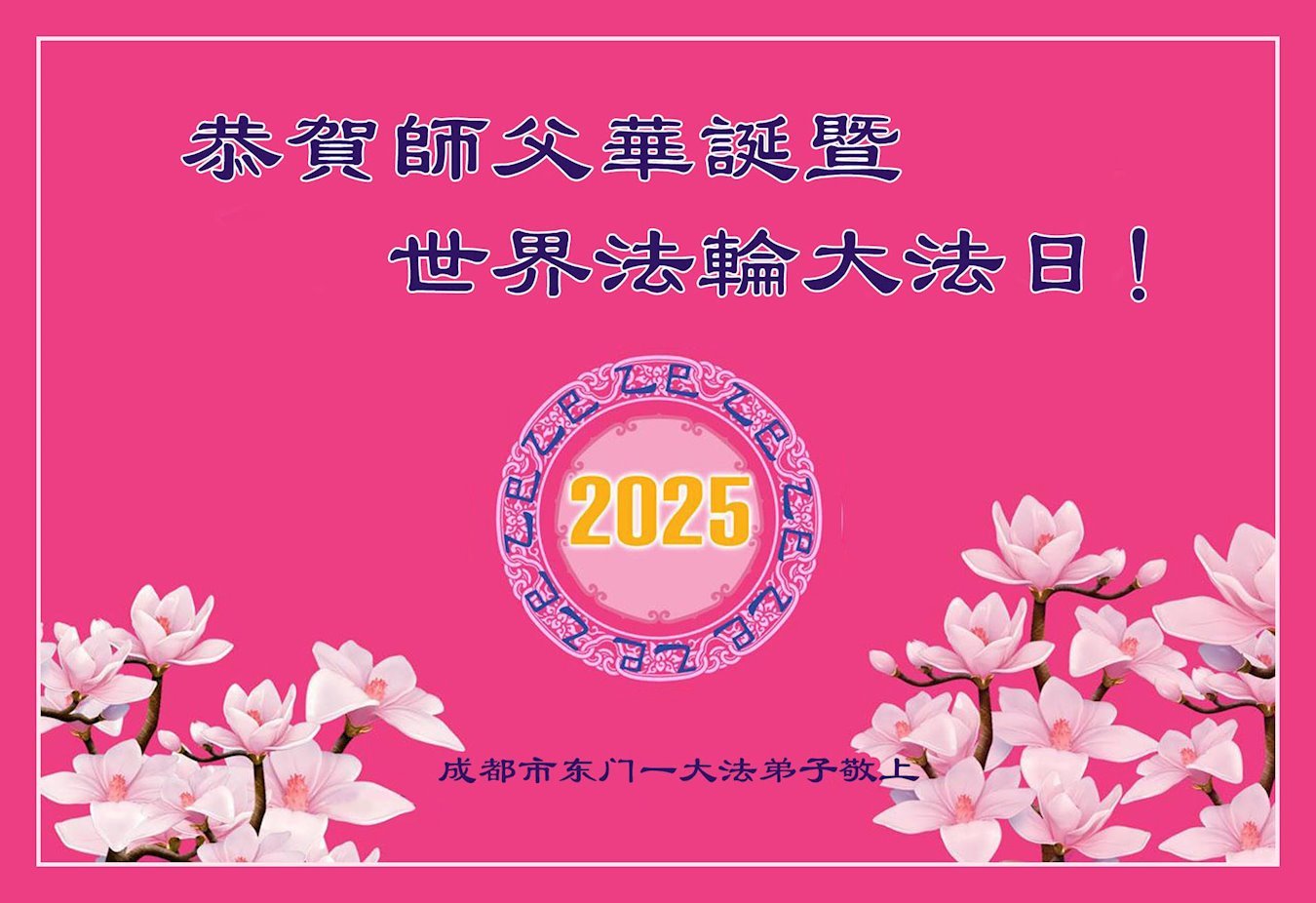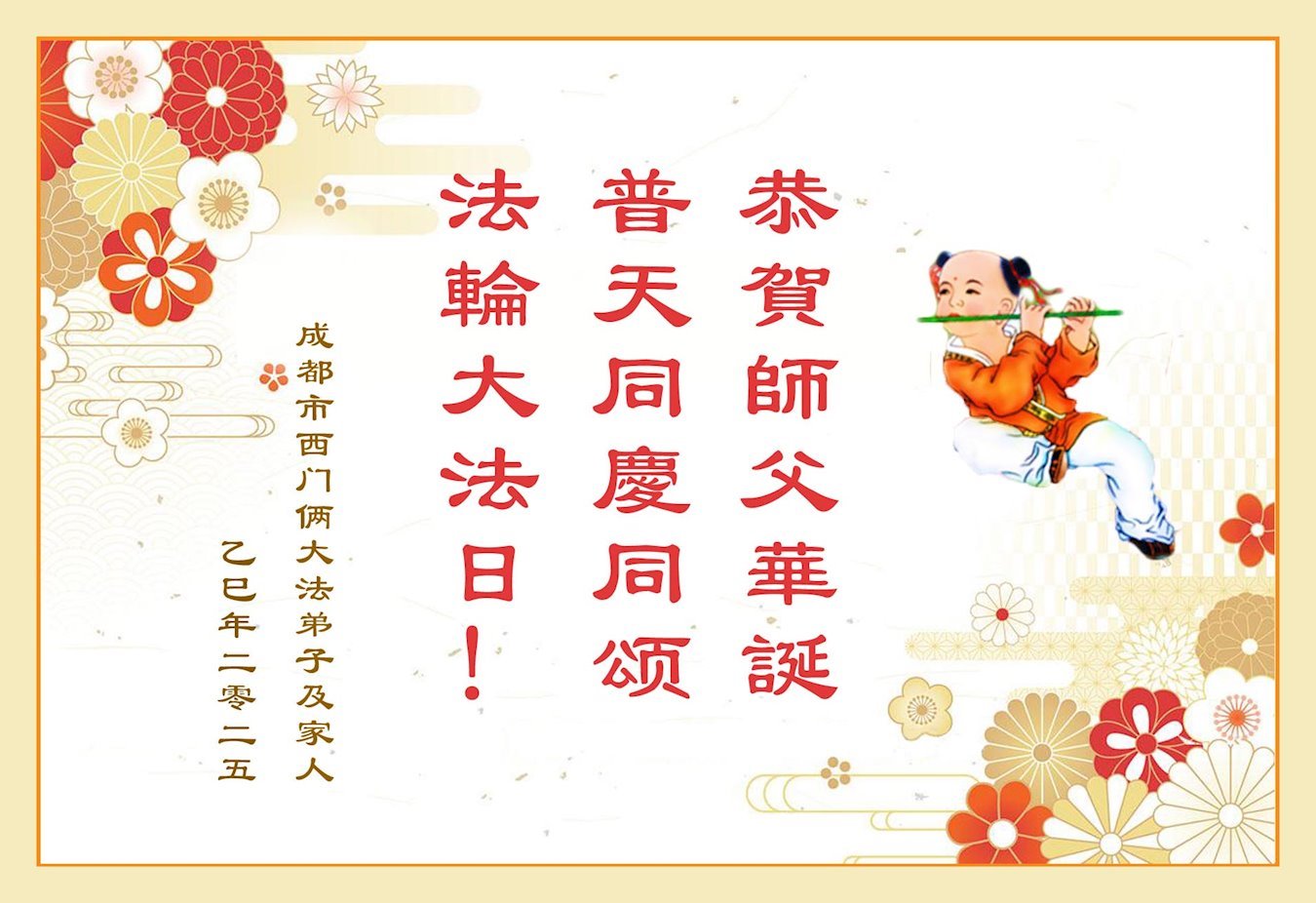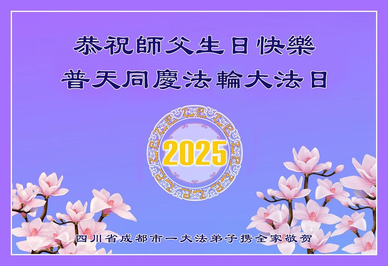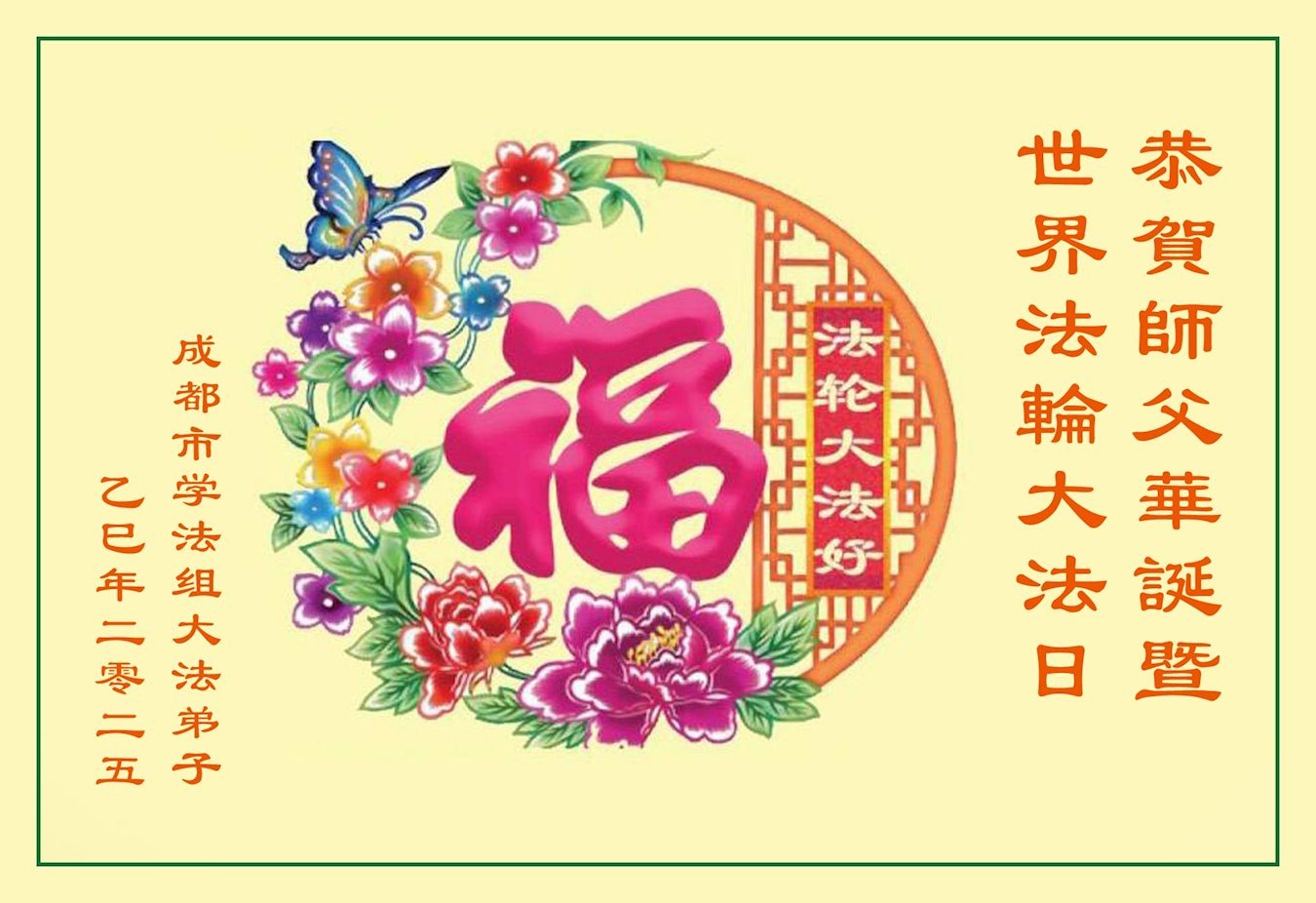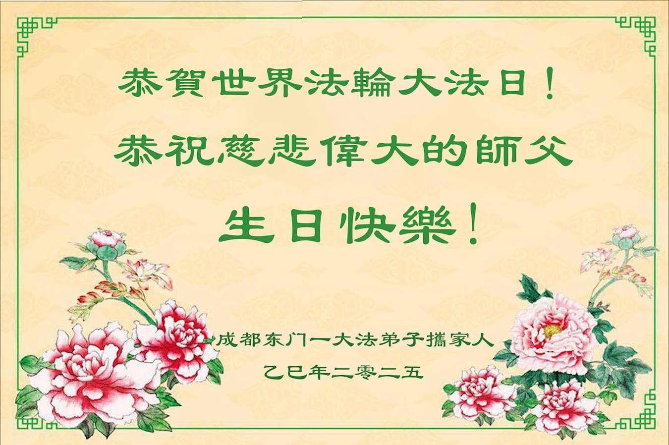 恭祝师父生日快乐!恭贺世界法轮大法日! 四川省成都彭州大法弟子及家人敬上 二零二五年四月二十九日 四川省成都市东门一大法弟子携家人恭贺世界法轮大法日暨敬祝师尊生日快乐!恭贺法轮大法洪传33周年!