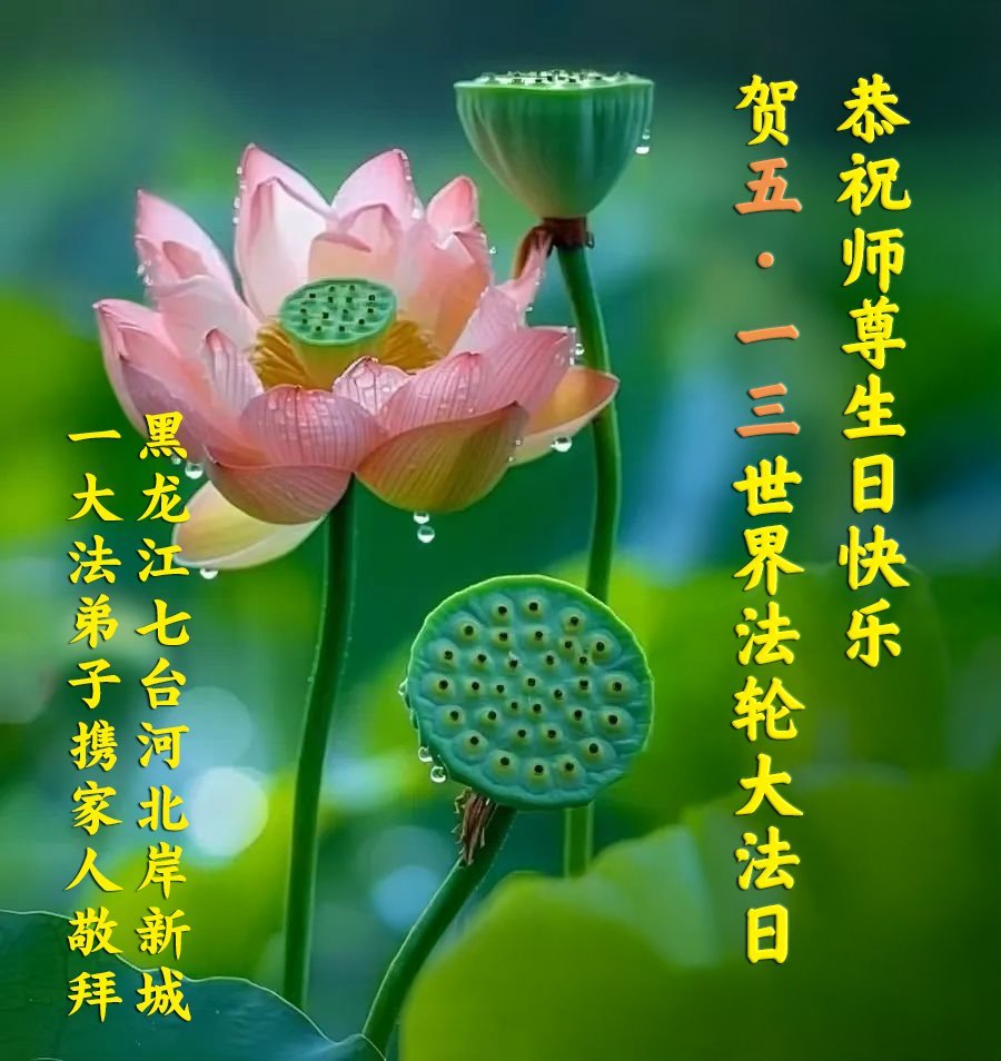 在这春暖花开芬芳四溢的美好五月里,迎来了每年一度的世界法轮大法日,河北省清河县两位大法弟子欢欣鼓舞,在此衷心恭贺世界法轮大法日暨师尊华诞!问声师父您辛苦了!无限感恩师父慈悲苦度,感恩之心无以表达,唯有精進实修,修好自己多救人!跟师父回家!谢谢师父!法轮大法好! 河北省邢台市清河县两位大法弟子敬上 二零二五年四月二十四日 黑龙江省七台河北岸新城一大法弟子恭祝师尊生日快乐!恭贺世界法轮大法日!