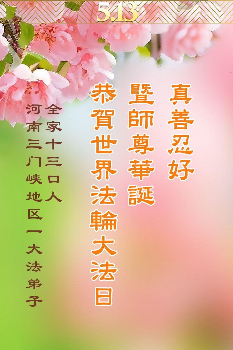 恭贺世界法轮大法日! 恭祝师父生日快乐! 河南省平顶山市市区大法弟子敬上 二零二五年四月十九日 河南三门峡地区一大法弟子全家十三人恭贺世界法轮大法日!恭祝师父生日快乐!