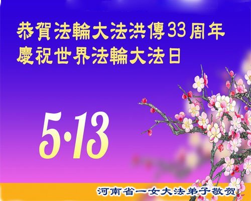 恭贺513世界法轮大法日! 恭祝师父生日快乐! 师尊您辛苦了:您为每个弟子能平安回家付出的太多太多,是您从迷中把弟子们找到,唤醒;又慈悲的告诉弟子回家的路怎样走好;并用巨大的承受与担当带领着弟子,保护着弟子,我们有这样伟大而慈悲的师父,就要好好听师尊的话,努力做好三件事,圆满跟师父回家,让师父多一份欣慰,少一份操劳,无论发生什么情况我们都会坚修大法到底。 感恩师尊! 河南一女大法弟子敬上 2025年4月20日 河南省平顶山市市区学法小组大法弟子恭贺世界法轮大法日暨恭祝师父生日快乐!