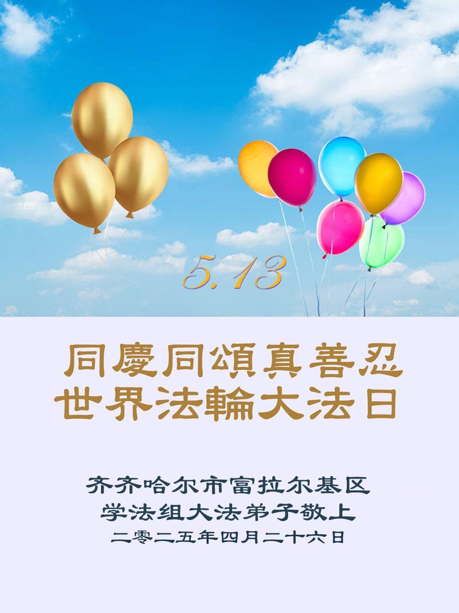 黑龙江省齐齐哈尔富裕县大法弟子敬上 二零二五年四月二十五日 黑龙江省齐齐哈尔市富拉尔基区学法小组大法弟子普天同庆世界法轮大法日!