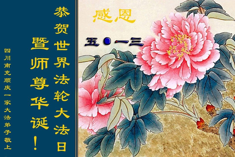 恭贺世界法轮大法日暨师尊华诞! 师尊您辛苦了!感恩师尊在这个日子将法轮大法洪传于世!贺大法洪传三十三周年暨第二十六届世界法轮大法日!感恩师尊为救众生付出的艰辛与巨大承受!众生将永远铭记您的洪恩圣典! 弟子们唯有多学法,学好法,在法中升华修好自己,才能更好的做好三件事,跟上师尊的正法進程,助师正法多救世人,不辜负师尊的教诲,不负“大法徒”的神圣称号。弟子们叩拜师恩! 四川省南充市顺庆区一家三位大法弟子敬上 四川省达州市开江县母女俩大法弟子恭祝师尊生日快乐!敬贺世界法轮大法日!