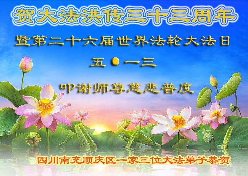 庆贺世界法轮大法日!恭祝师尊华诞! 四川省内江大法弟子敬上 四川省南充市顺庆区一家三位大法弟子恭贺世界法轮大法日暨师尊华诞!