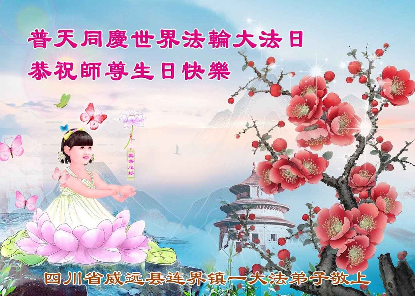 普天同庆世界法轮大法日!恭祝师尊生日快乐! 四川省威远县连界镇一大法弟子敬上 四川达州通川区一老年女大法弟子和全家四代十六人恭贺世界法轮大法日暨师父生日快乐!