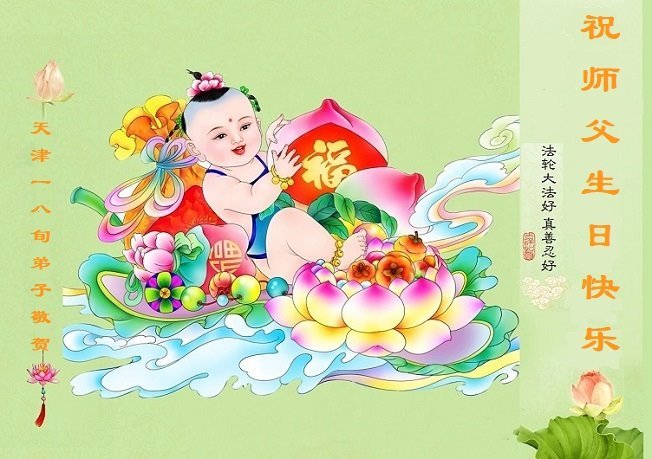 恭贺世界法轮大法日! 恭祝师尊生日快乐! 天津一八旬弟子敬上 天津市一老年大法弟子恭贺世界法轮大法日暨师尊生日快乐!