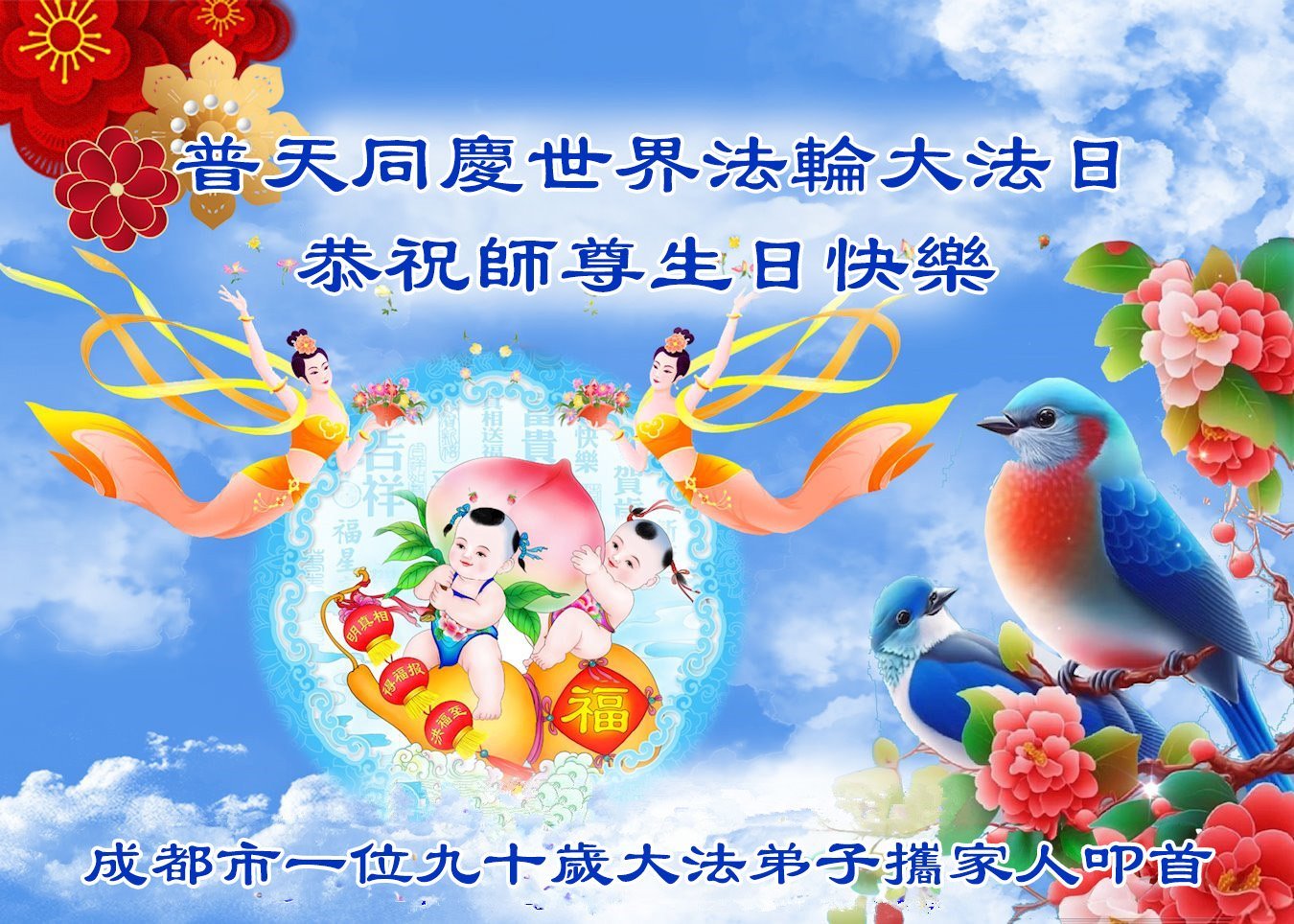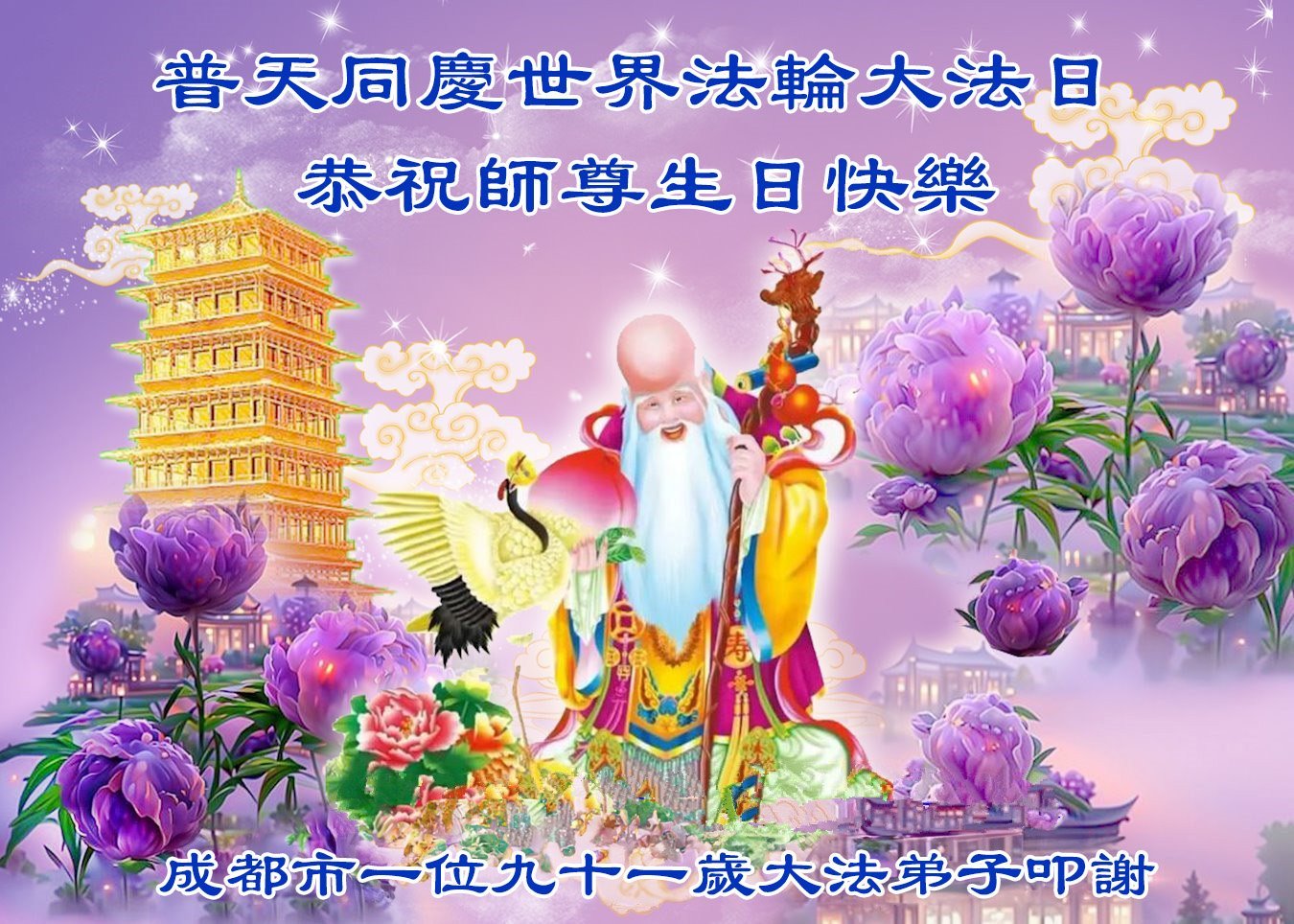 恭贺世界法轮大法日! 恭祝师父生日快乐! 四川省成都市龙泉驿区大法弟子敬上 二零二五年四月二十二日 四川省成都市一91岁大法弟子恭贺世界法轮大法日暨师父华诞!