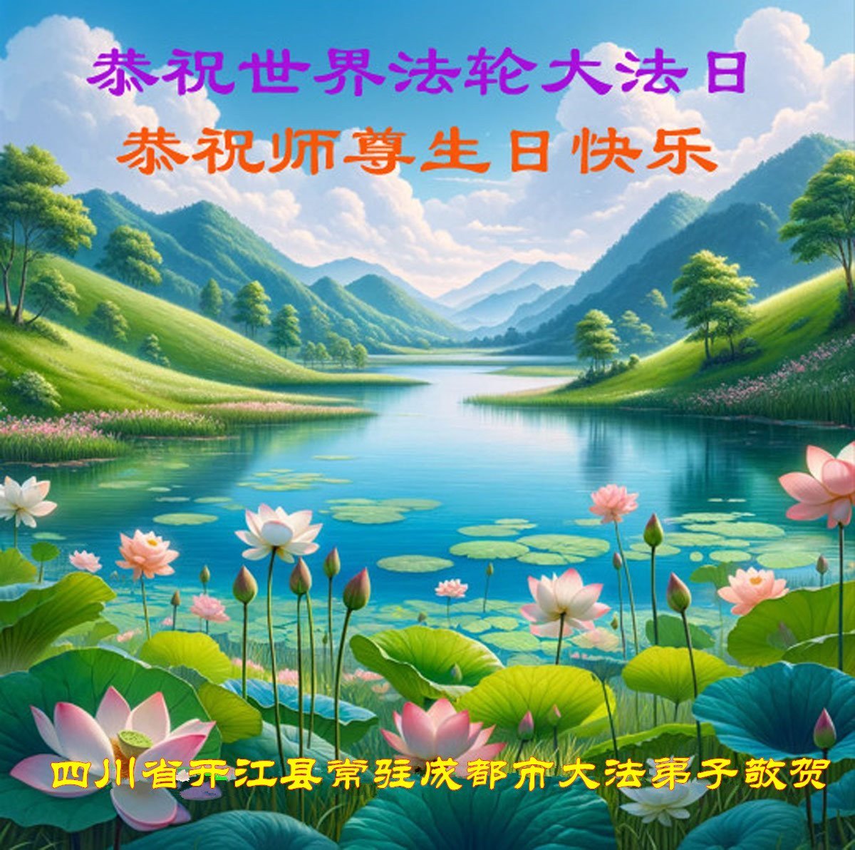 恭贺世界法轮大法日!恭祝师尊华诞! 感恩佛恩浩荡,生命有了真正的归宿。 修己救人,这是生命最大的荣耀。 一个将被红尘淹没的生命,一个看不到任何希望的生命,在幸遇大法的那一瞬间从此改变。真善忍的最高法理,保护我走过了无数的魔难与险关,每时每刻都感受到佛法的光明与慈悲。请师父放心,弟子一定会做好三件事,完成使命,随师回家。师恩难忘,佛恩浩荡! 四川省成都市锦江区大法弟子全家敬上 二零二五年四月二十日 四川成都市大法弟子恭贺世界法轮大法日暨师尊生日快乐!