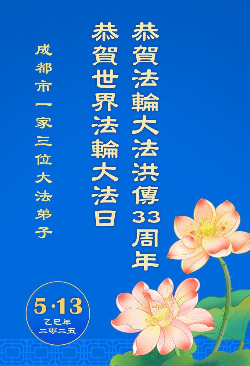 【明慧网二零二五年五月十日】 四川成都市一家三位大法弟子恭贺世界法轮大法日暨敬祝师尊华诞!
