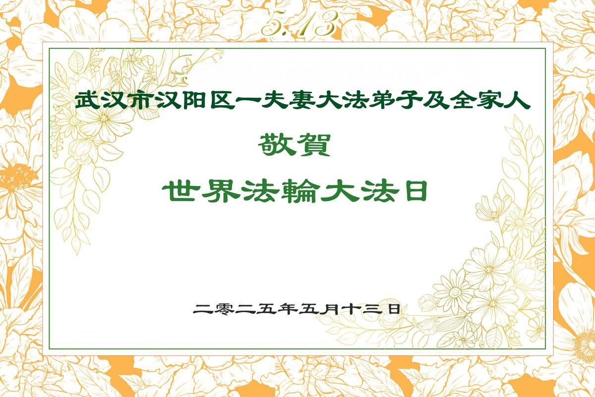 恭祝师尊生日快乐! 恭贺513世界法轮大法日! 湖北省十堰市一大法弟子敬上 二零二五年四月二十五日 湖北省武汉市汉阳区一夫妻大法弟子及全家人恭贺世界法轮大法日暨师尊生日快乐!