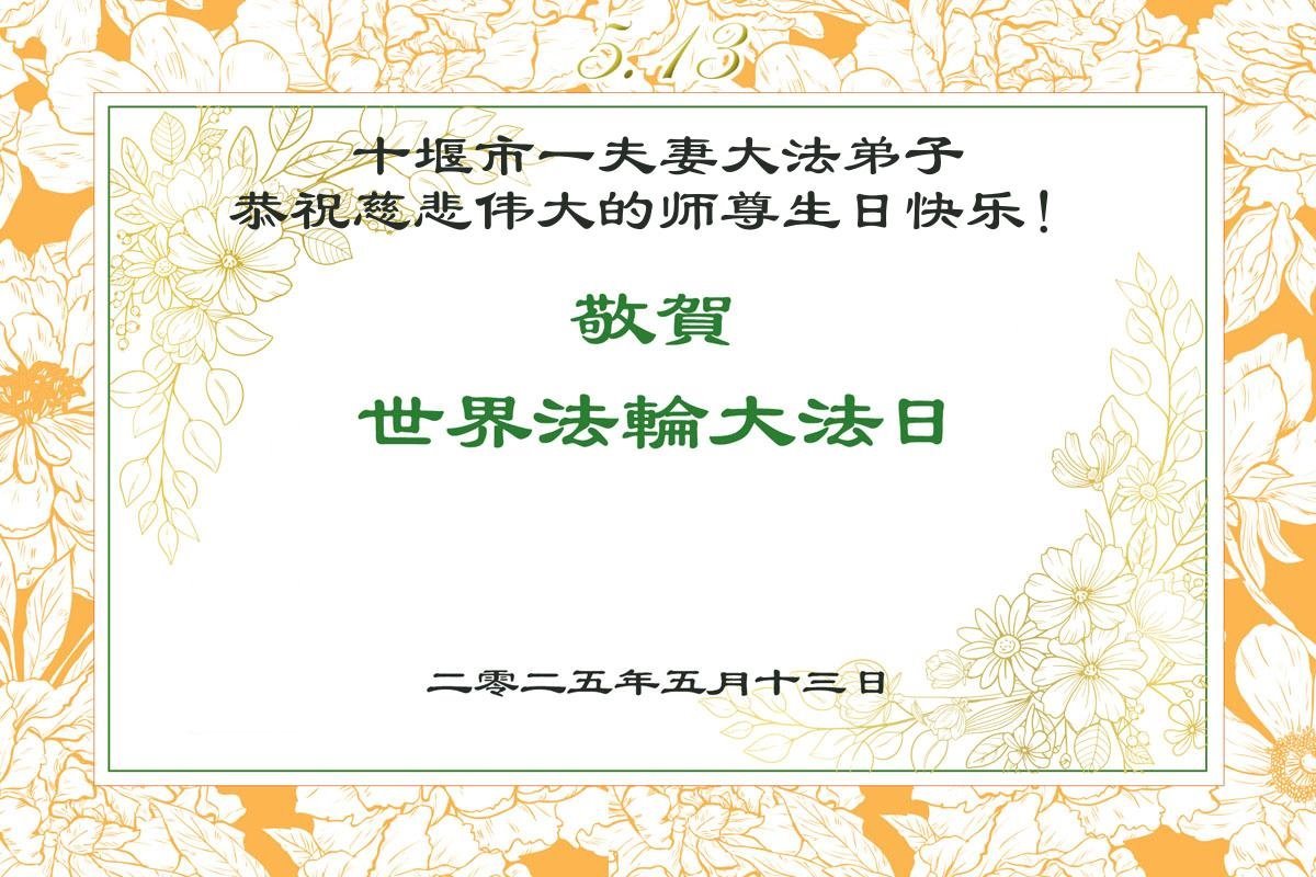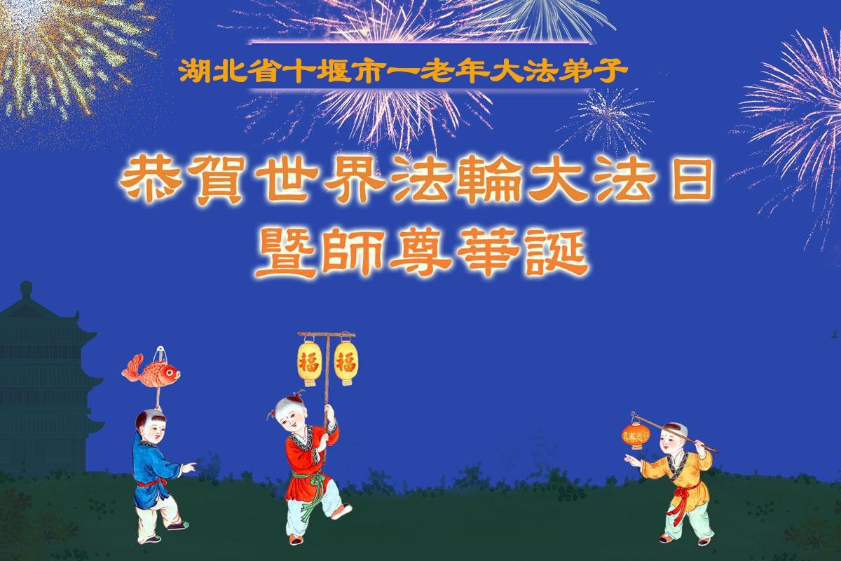 在五·一三这普天同庆的美好日子到来之际,弟子及全家人恭祝慈悲伟大的师尊生日快乐!恭贺世界法轮大法日! 湖北省武汉市汉阳区一夫妻大法弟子及全家人敬上 二零二五年四月二十五日 湖北省十堰市一老年大法弟子恭贺513世界法轮大法日暨师尊生日快乐!