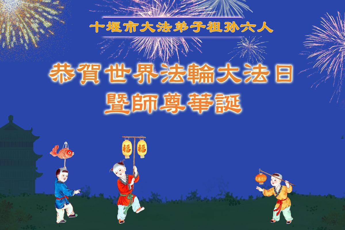 恭祝师尊生日快乐! 贺5.13世界法轮大法日! 湖北省十堰市大法弟子祖孙六人敬上 二零二五年四月二十五日 湖北省大法弟子恭贺世界法轮大法日!恭祝师尊生日快乐!