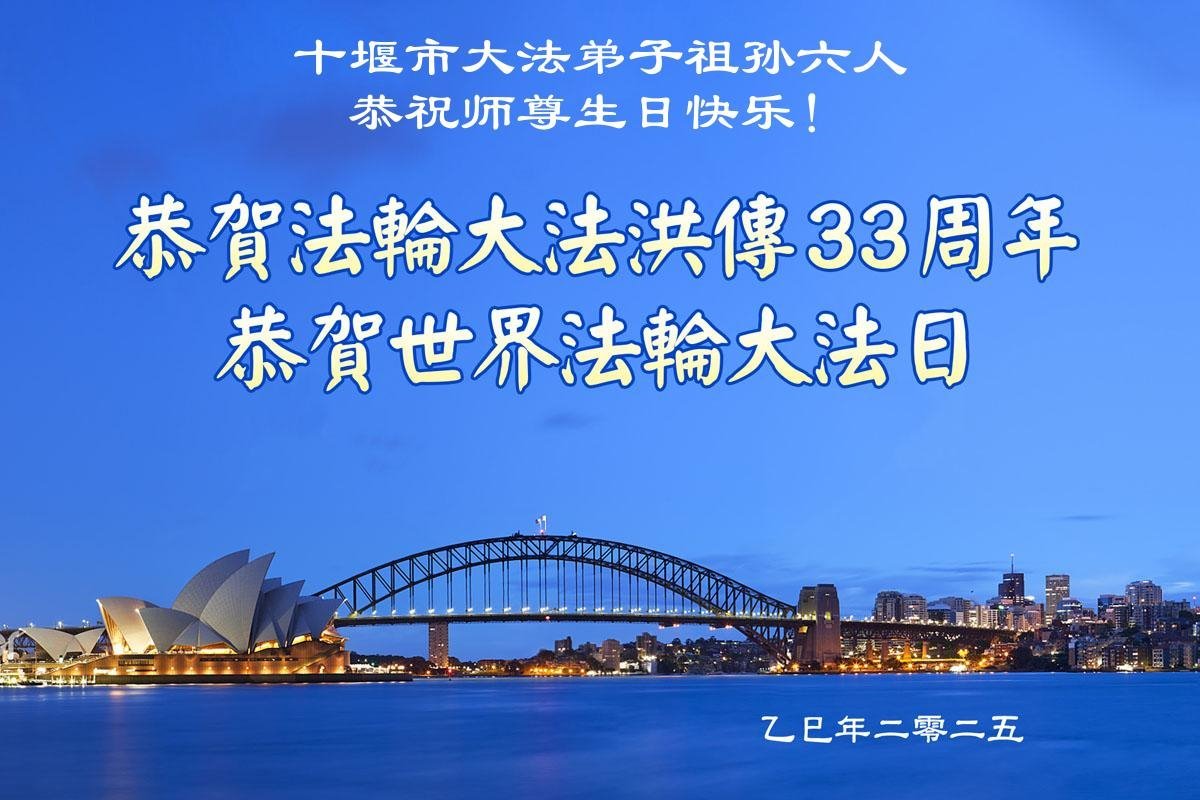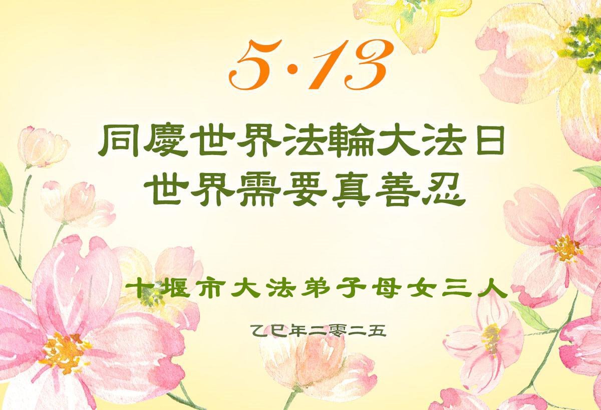 恭祝师尊生日快乐! 恭贺5.13世界法轮大法日! 湖北十堰市大法弟子祖孙六人敬上 二零二五年四月二十五日 湖北十堰市大法弟子母女三人恭贺513世界法轮大法日暨师尊生日快乐!