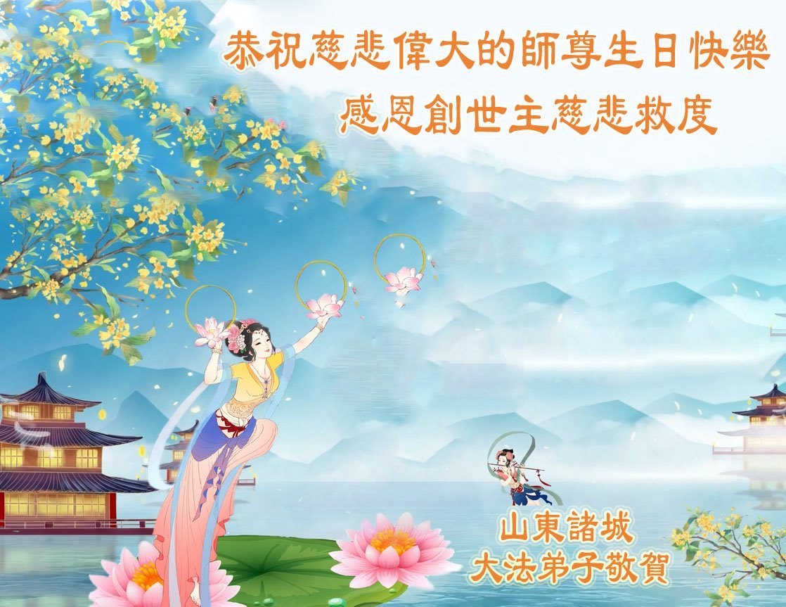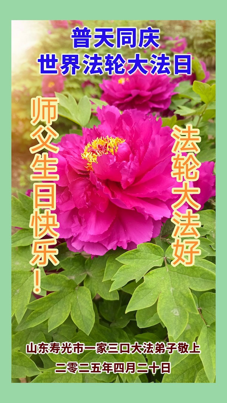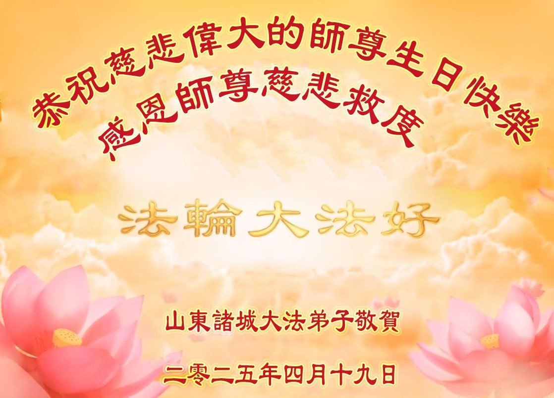 山东省诸城一学法小组大法弟子,恭祝慈悲伟大的师尊生日快乐! 师尊华诞洪穹普天同庆同颂! “五一三”大法神圣节日苍宇同歌同舞! 做好三件事,满载众生新宇还! 叩谢师恩! 山东省诸城一学法小组大法弟子敬上 二零二五年四月十九日 山东省潍坊市诸城市一学法小组大法弟子恭贺世界法轮大法日暨师尊华诞!