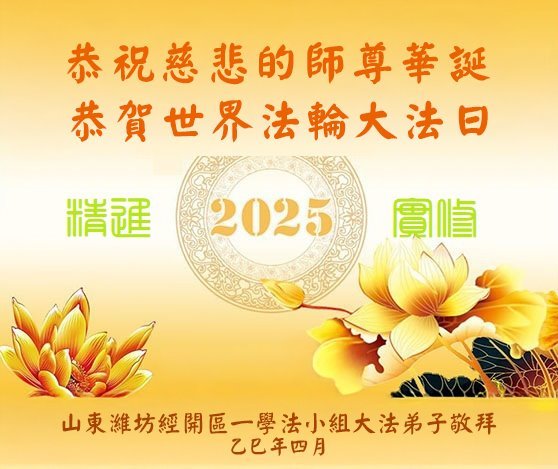 【明慧网二零二五年五月十日】 山东潍坊经济开发区一学法小组大法弟子恭贺世界法轮大法日暨师父华诞!