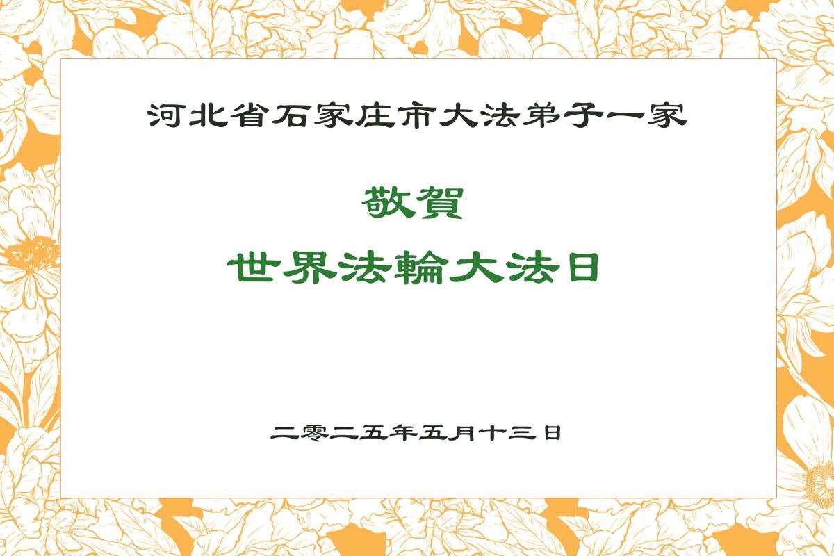 河北省石家庄市三人学法小组大法弟子敬上 二零二五年四月二十四日 河北省石家庄市大法弟子一家恭贺世界法轮大法日暨师父华诞!