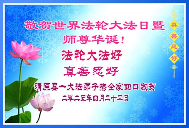 辽宁省清原县一大法弟子携全家四口人恭贺世界法轮大法日暨师尊华诞!