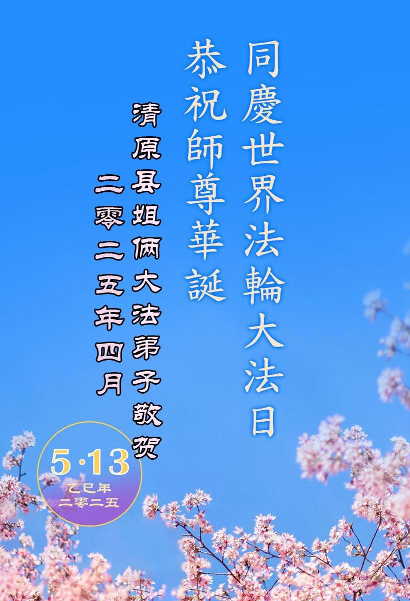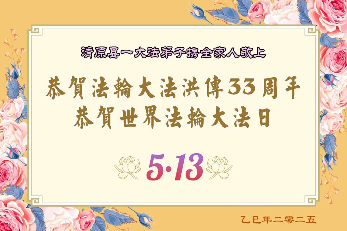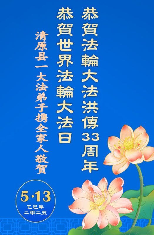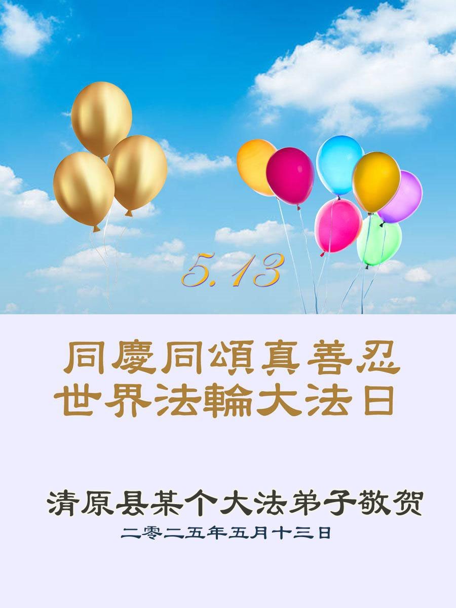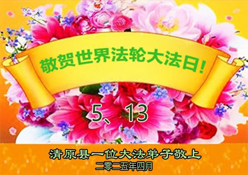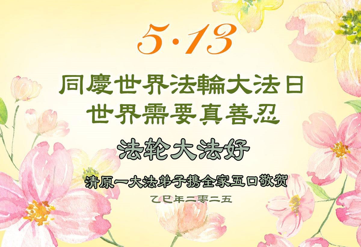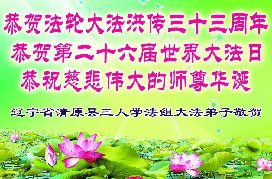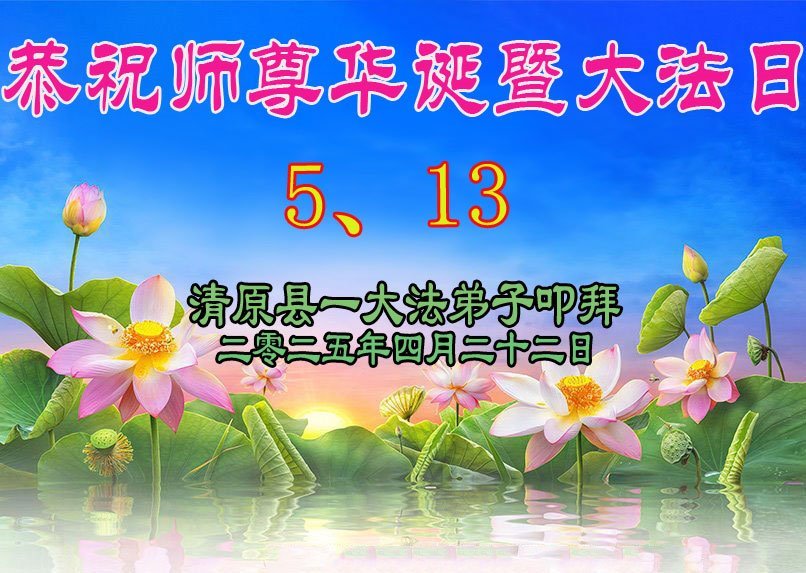 【明慧网二零二五年五月十日】 辽宁省抚顺市清原县三人学法组恭贺世界法轮大法日暨敬祝师尊生日快乐!
