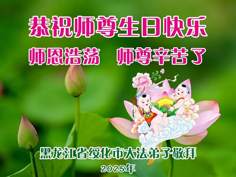 在以后的日子里,弟子要严格要求自己,做好三件事。让师父为弟子少承受一份业力,少操一份心,多一份欣慰! 黑龙江省绥化市两名大法弟子叩拜 二零二五年四月二十六日 黑龙江省绥化市大法弟子恭贺世界法轮大法日!敬祝师尊生日快乐!