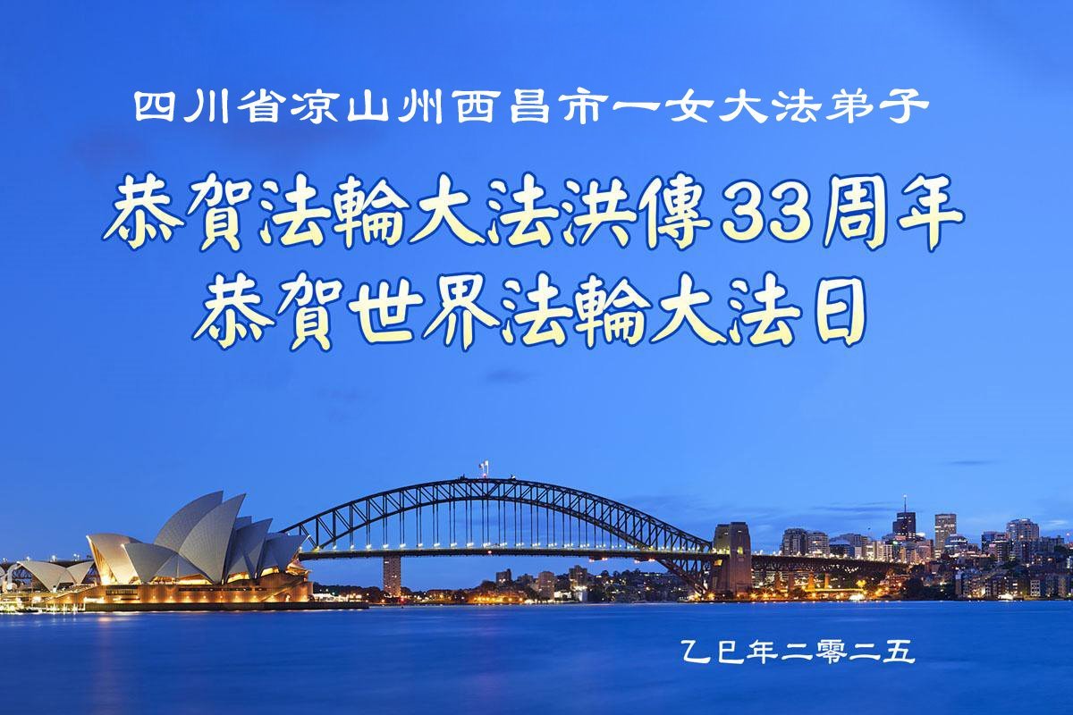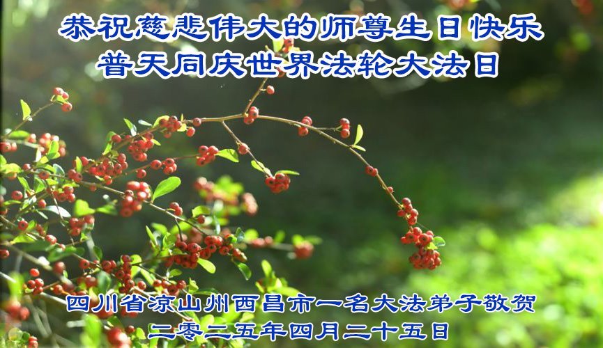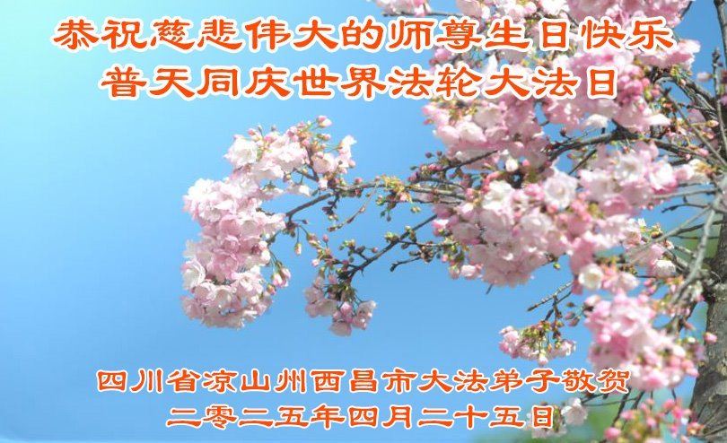 在“五·一三”这个殊胜而感恩的日子, 恭贺第二十六届世界法轮大法日暨师父华诞!庆祝法轮大法洪传三十三周年! 师父您辛苦了!弟子感恩师父慈悲传法普度。在师父的保护下弟子走过了二十多年,弟子对师父的感恩无以言表!谢谢师父!弟子只有做好三件事回报师恩。 四川南充顺庆一大法弟子敬上 二零二五年四月二十五日 四川省凉山州西昌市一女大法弟子恭贺世界法轮大法日暨师尊华诞!