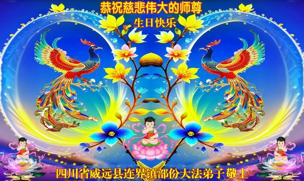 恭祝师尊生日快乐!普天同庆世界法轮大法日! 四川省威远县连界镇一大法弟子携女儿敬上 四川省内江市威远县连界镇部份大法弟子恭祝慈悲伟大的师尊生日快乐!恭贺世界法轮大法日!
