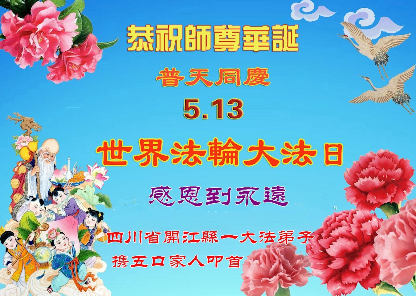 恭祝师尊华诞!普天同庆5·13世界法轮大法日!感恩到永远! 四川省开江县一大法弟子携五口家人敬上 四川省达州市开江县一大法弟子携七口家人恭祝师父华诞!恭贺世界法轮大法日!