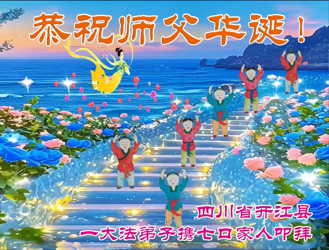 恭祝慈悲伟大的师尊生日快乐!恭贺世界法轮大法日! 四川省威远县连界镇部份大法弟子敬上 四川省达州市开江县一大法弟子携五口家人恭祝师尊华诞!恭贺世界法轮大法日!