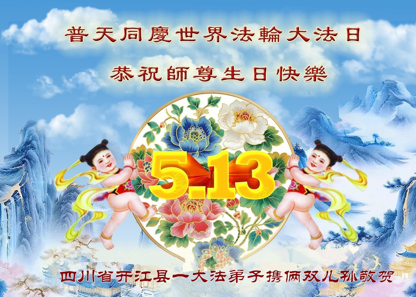普天同庆世界法轮大法日!恭祝师尊生日快乐! 四川省开江县一大法弟子携俩双儿孙敬上 四川省凉山州西昌市一老年女大法弟子恭贺世界法轮大法日暨师尊华诞!