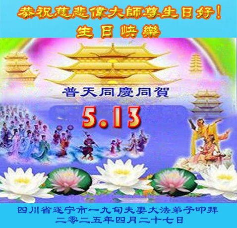师尊您好!您辛苦了!感恩师尊慈悲普度! 四川南充一位七十多岁的大法弟子敬上 二零二五年四月二十七日 四川省遂宁市一九旬夫妻大法弟子恭贺世界法轮大法日暨敬祝师尊生日快乐!