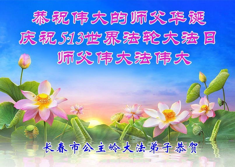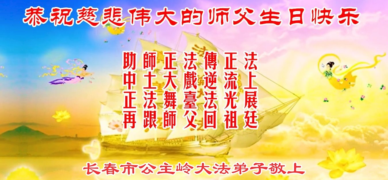 恭祝慈悲伟大的师父生日快乐!恭贺世界法轮大法日! 长春市农安县伏龙泉镇两位大法弟子敬上 吉林省长春市公主岭大法弟子恭祝慈悲伟大的师父华诞!恭贺世界法轮大法日!