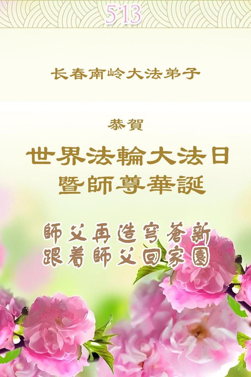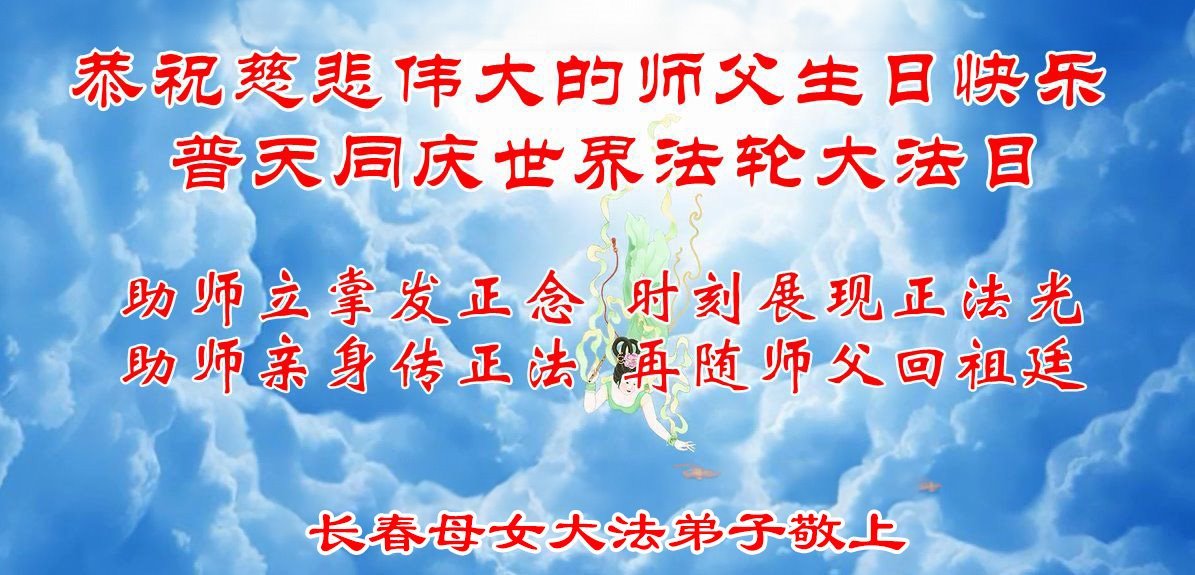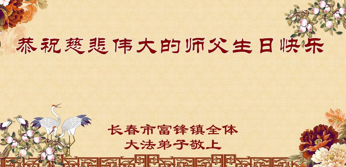 恭贺世界法轮大法日暨师尊华诞! 吉林省长春南岭大法弟子敬上 吉林省长春市富锋镇三位大法弟子恭祝慈悲伟大的师父华诞暨世界法轮大法日!