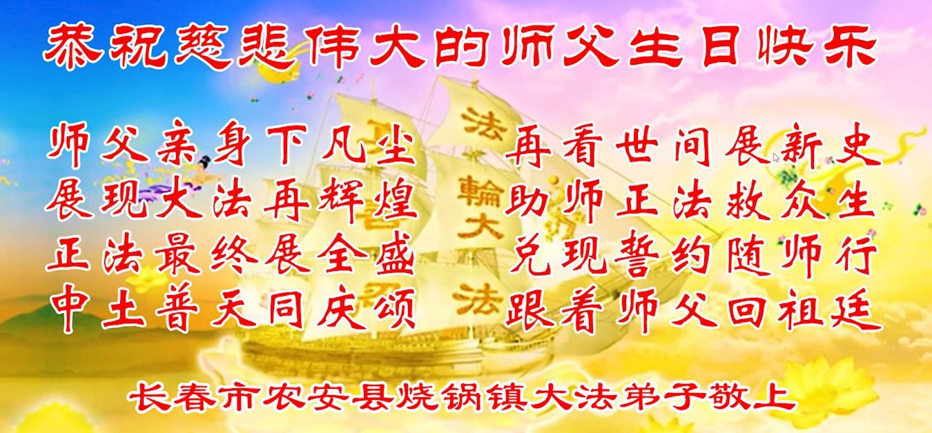 恭祝师父生日快乐!敬贺世界法轮大法日! 吉林省长春刚修炼的夫妻大法弟子敬上 吉林省长春市农安县烧锅镇大法弟子恭祝慈悲伟大的师父生日快乐!恭贺世界法轮大法日!