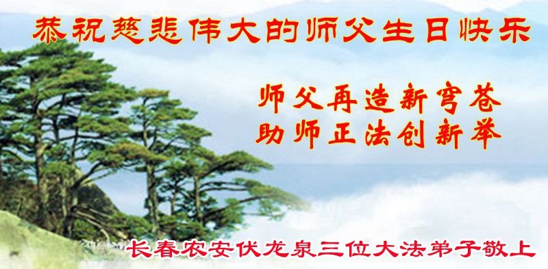 恭祝慈悲伟大的师父生日快乐!恭贺世界法轮大法日! 吉林省长春农安伏龙泉三位大法弟子敬上 吉林省长春市宽城区大法弟子恭祝慈悲伟大的师父生日快乐!恭贺世界法轮大法日!