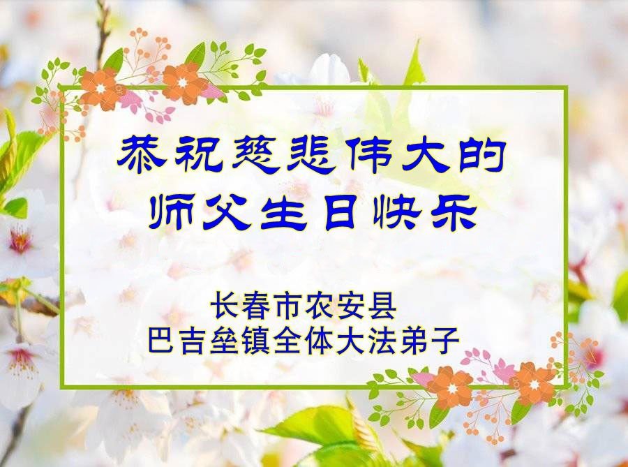 恭祝师父生日快乐!恭贺世界法轮大法日! 吉林省长春刚修炼的夫妻大法弟子敬上 吉林省长春市农安县巴吉垒镇全体大法弟子恭祝慈悲伟大的师父生日快乐!恭贺世界法轮大法日!