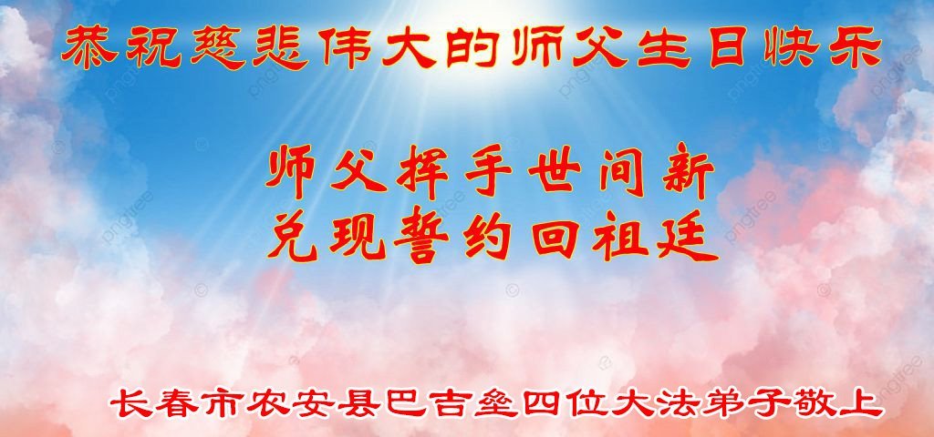 恭祝慈悲伟大的师父生日快乐!恭贺世界法轮大法日! 吉林省长春市农安县巴吉垒四位大法弟子敬上 |