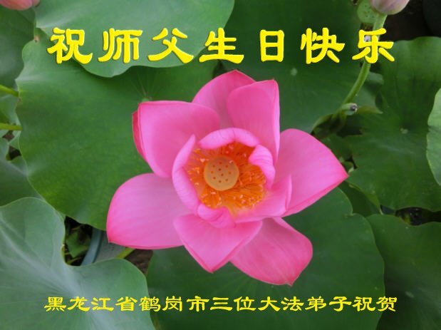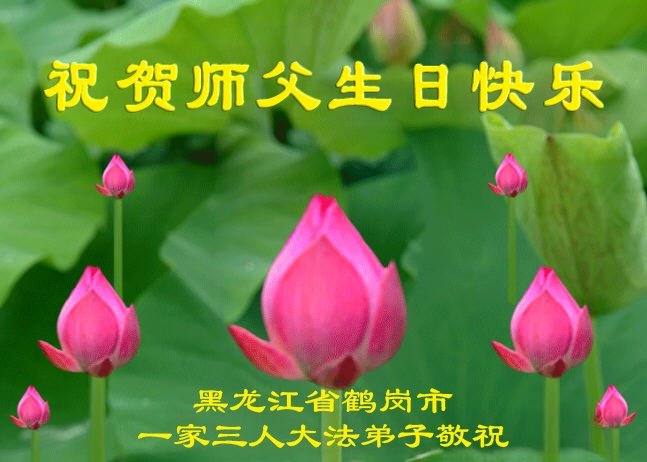 恭祝师父生日快乐!恭贺世界法轮大法日! 黑龙江省鹤岗市一大法弟子敬上 黑龙江省鹤岗市一家三位大法弟子敬祝师父生日快乐!恭贺世界法轮大法日!