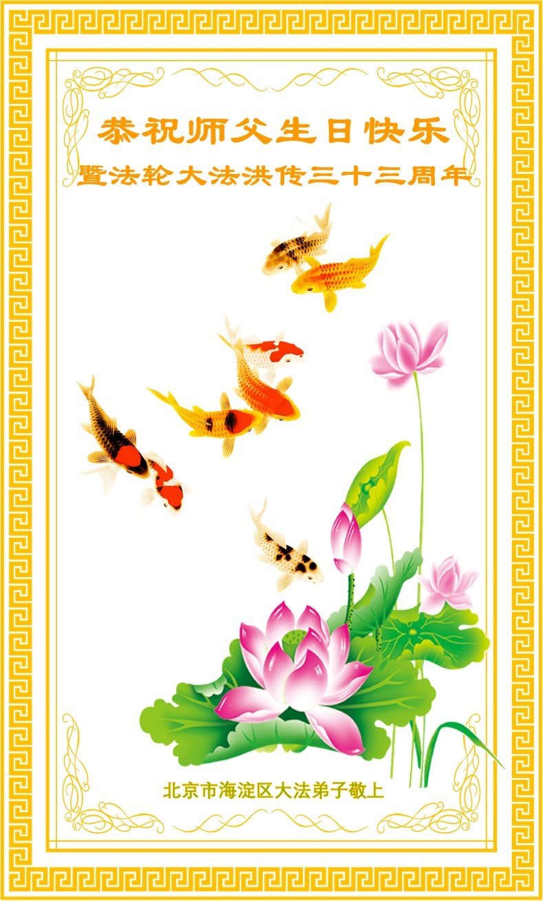 恭祝慈悲伟大的师尊生日快乐! 庆祝法轮大法洪传33周年!庆祝世界法轮大法日! 北京西城一大法弟子敬上 北京市海淀区一学法小组大法弟子恭贺世界法轮大法日!