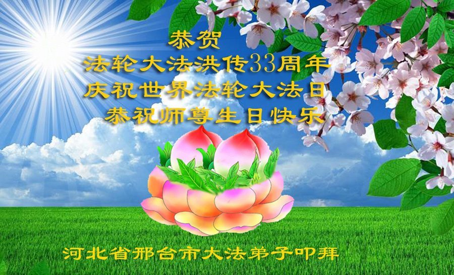 弟子在此生却遇到了伟大的师父,修炼了伟大的法。无限感恩师尊把我从地狱里捞起洗净,无限感恩大法把我救度,在世界法轮大法日来临之际,弟子敬祝师尊生日快乐!恭贺第二十六个世界法轮大法日的到来!弟子跪拜师尊! 河北省沧州市河间市一大法弟子敬上 河北省邢台市大法弟子庆祝世界法轮大法日暨师尊华诞!