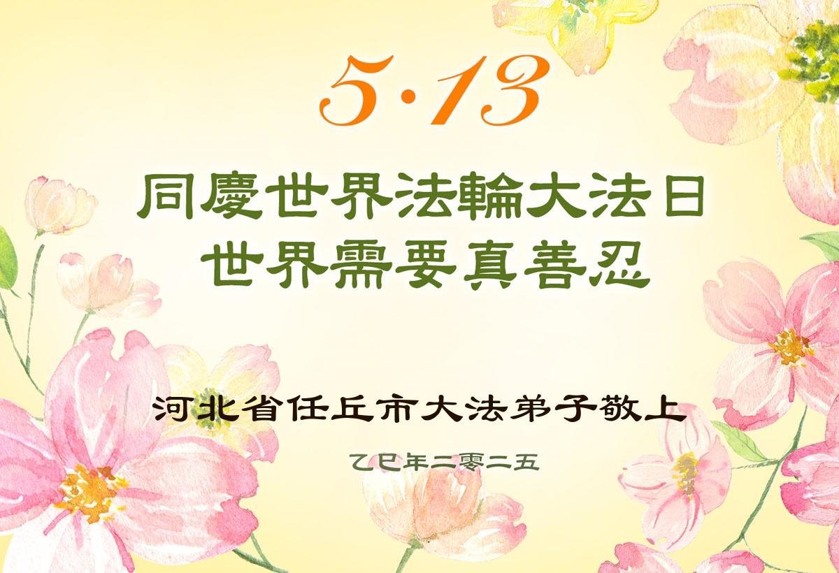 感恩师尊!感恩大法!弟子们唯有精進多救人以报师恩! 河北邢台宁晋一学法小组大法弟子敬上 河北省沧州市任丘市大法弟子恭贺5.13世界法轮大法日暨敬祝师尊生日快乐!