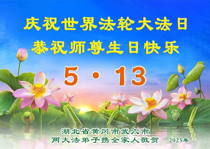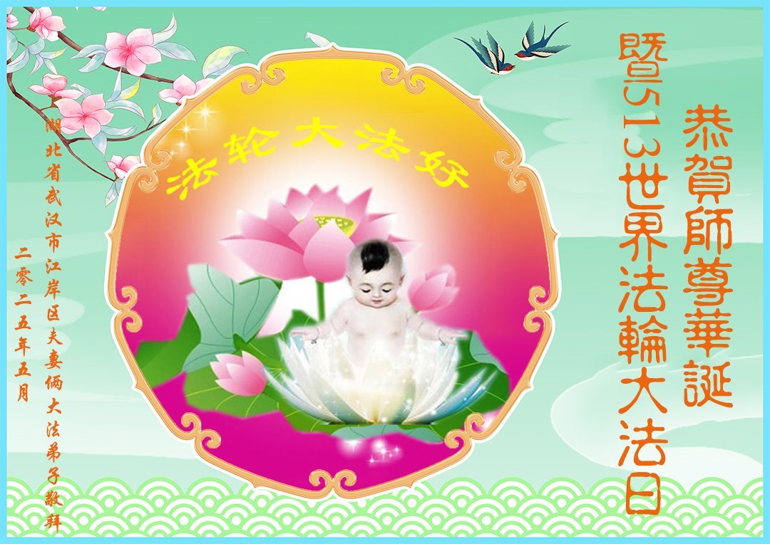 【明慧网二零二五年五月十日】 湖北省武汉市江岸区夫妻俩大法弟子恭贺世界法轮大法日暨敬祝师父生日快乐!