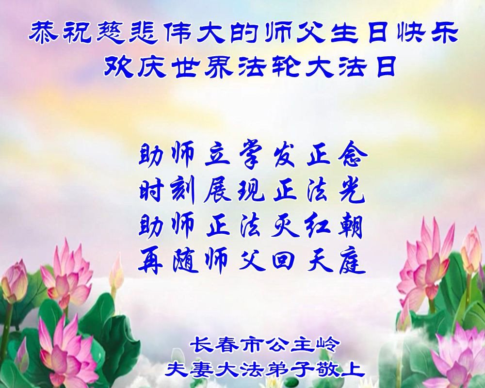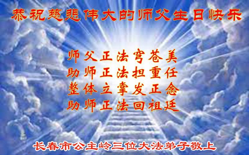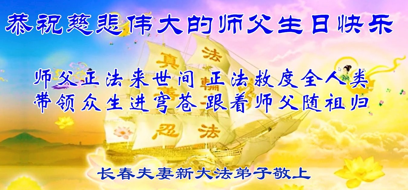 恭祝慈悲伟大的师父生日快乐!恭贺世界法轮大法日! 吉林省长春市公主岭三位大法弟子敬上 吉林省长春刚修炼的夫妻大法弟子恭祝慈悲伟大的师父生日快乐!恭贺世界法轮大法日!