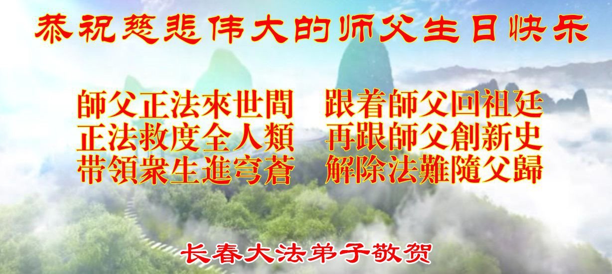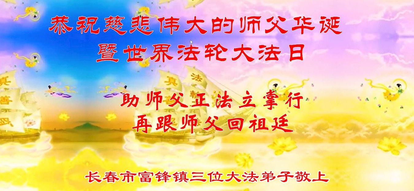 恭祝慈悲伟大的师父生日快乐!恭贺世界法轮大法日! 吉林省长春刚修炼的夫妻大法弟子敬上 吉林省长春市富锋镇三位大法弟子恭祝慈悲伟大的师父华诞!敬贺世界法轮大法日!