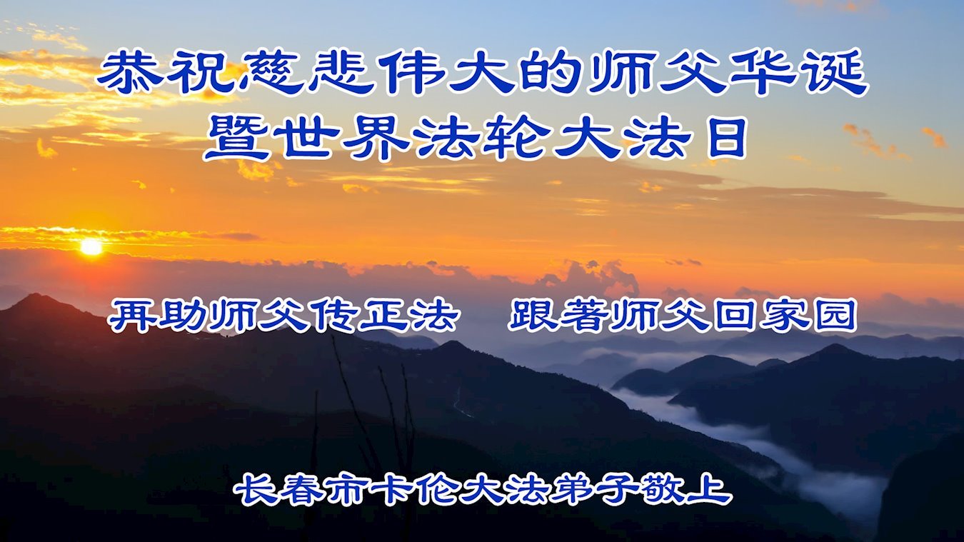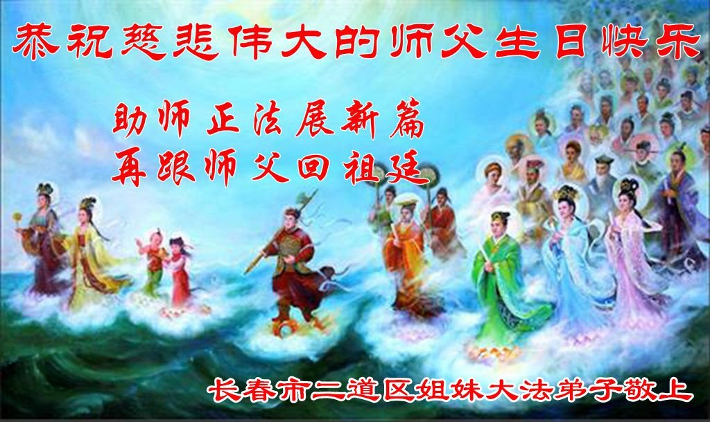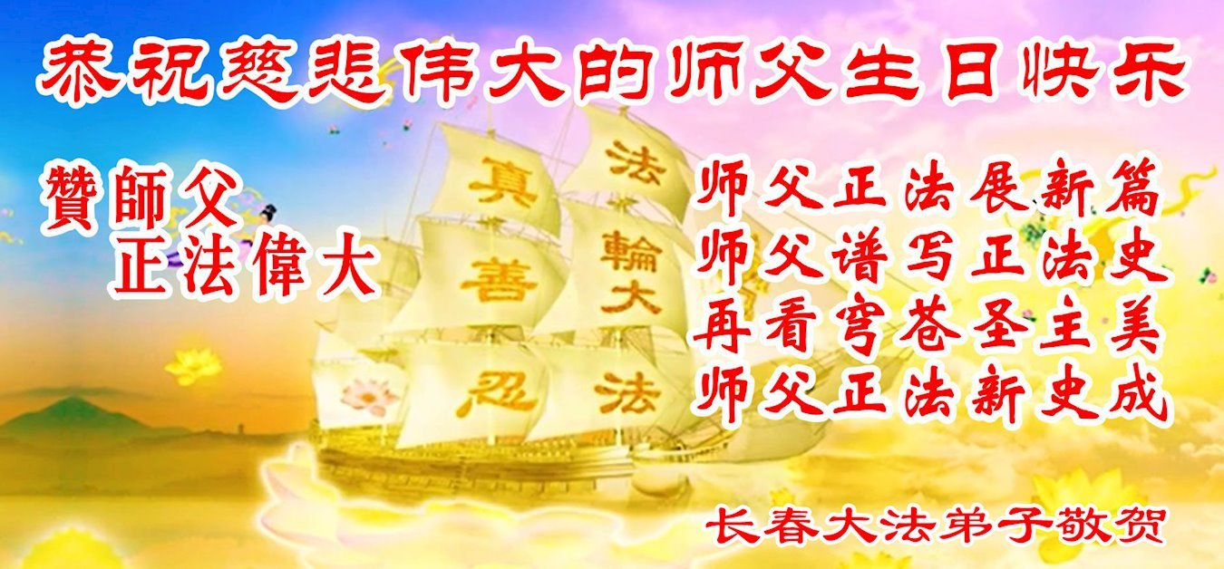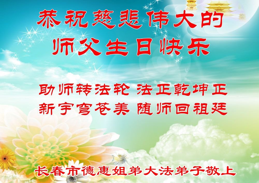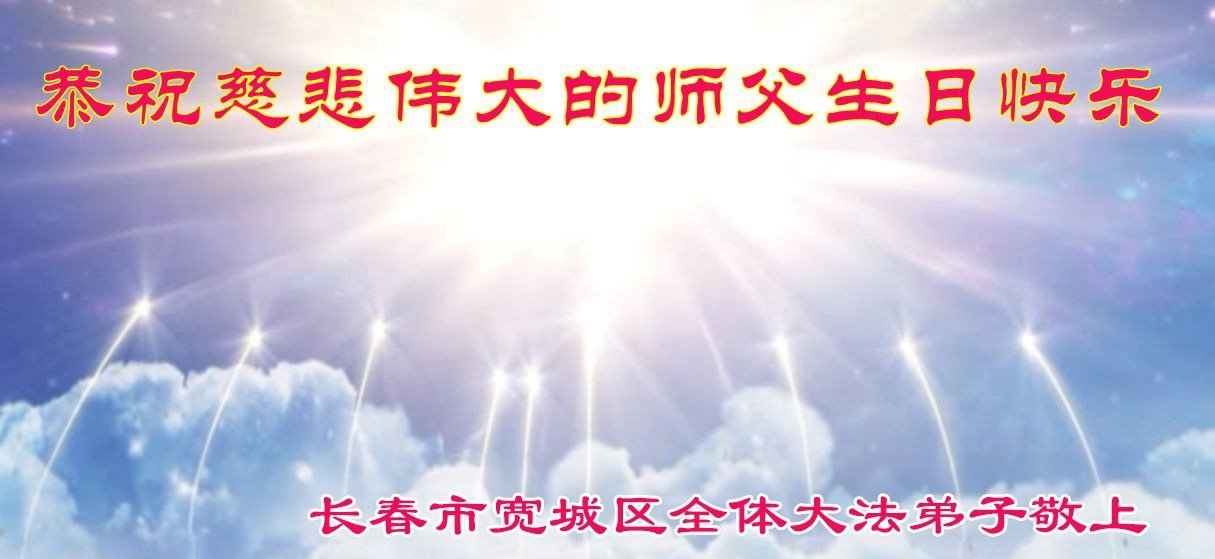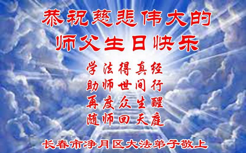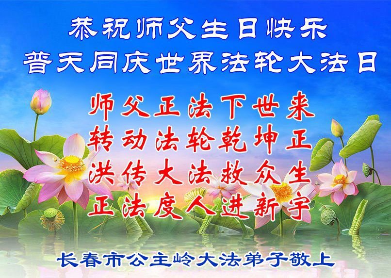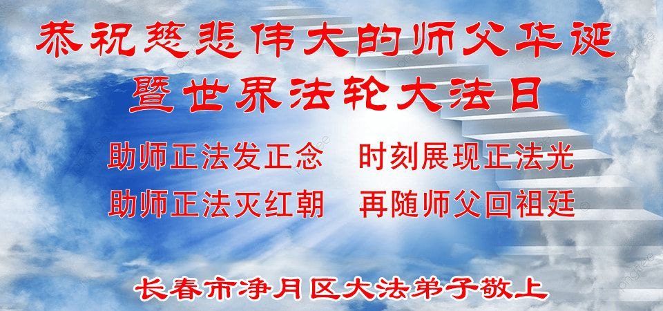 恭祝师父生日快乐!敬贺世界法轮大法日! 吉林省长春市公主岭大法弟子敬上 吉林省长春市宽城区全体大法弟子恭祝慈悲伟大的师父生日快乐!敬贺世界法轮大法日!